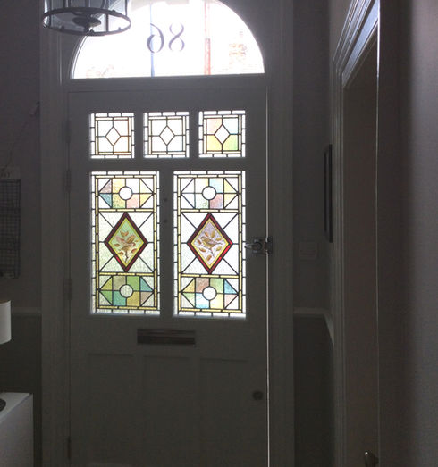 This Edwardian front door has decorative stained glass panels, a mushroom paint finish and satin chrome door furniture.