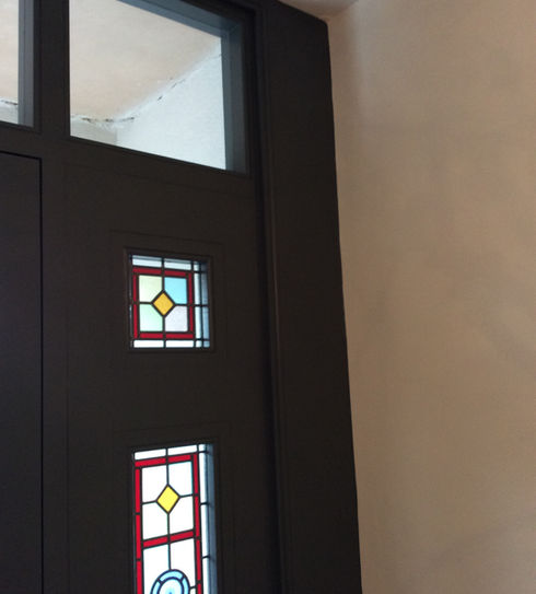 A beautiful Victorian front door design with colourful, handmade stained glass and satin chrome door furniture.